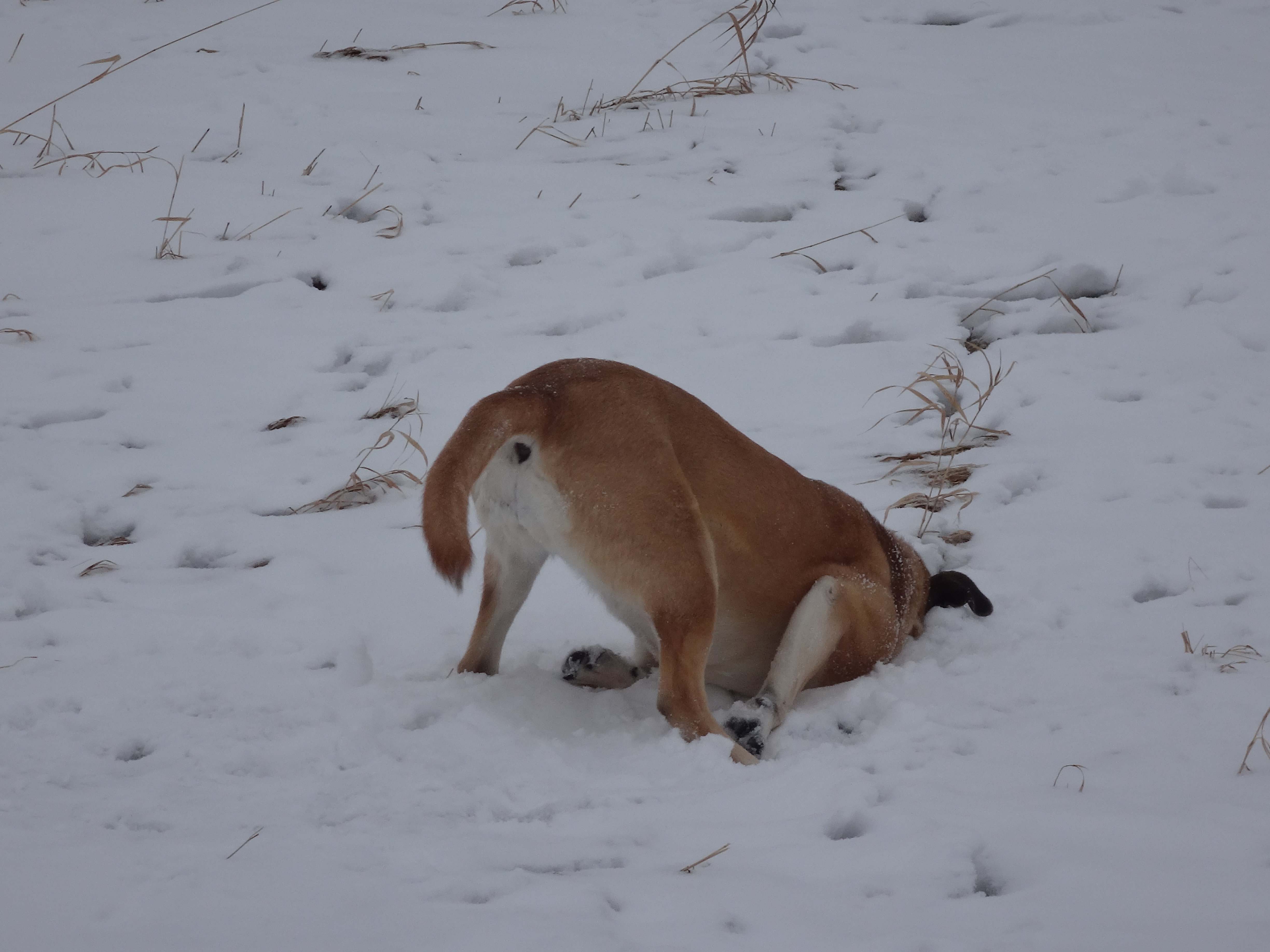 1. No fumble…it was all Lucy’s own work…she plunged her head into the snow and then had a good roll around with her legs in the air…a “Charlie Brown”…with a touch of Ruby roll.