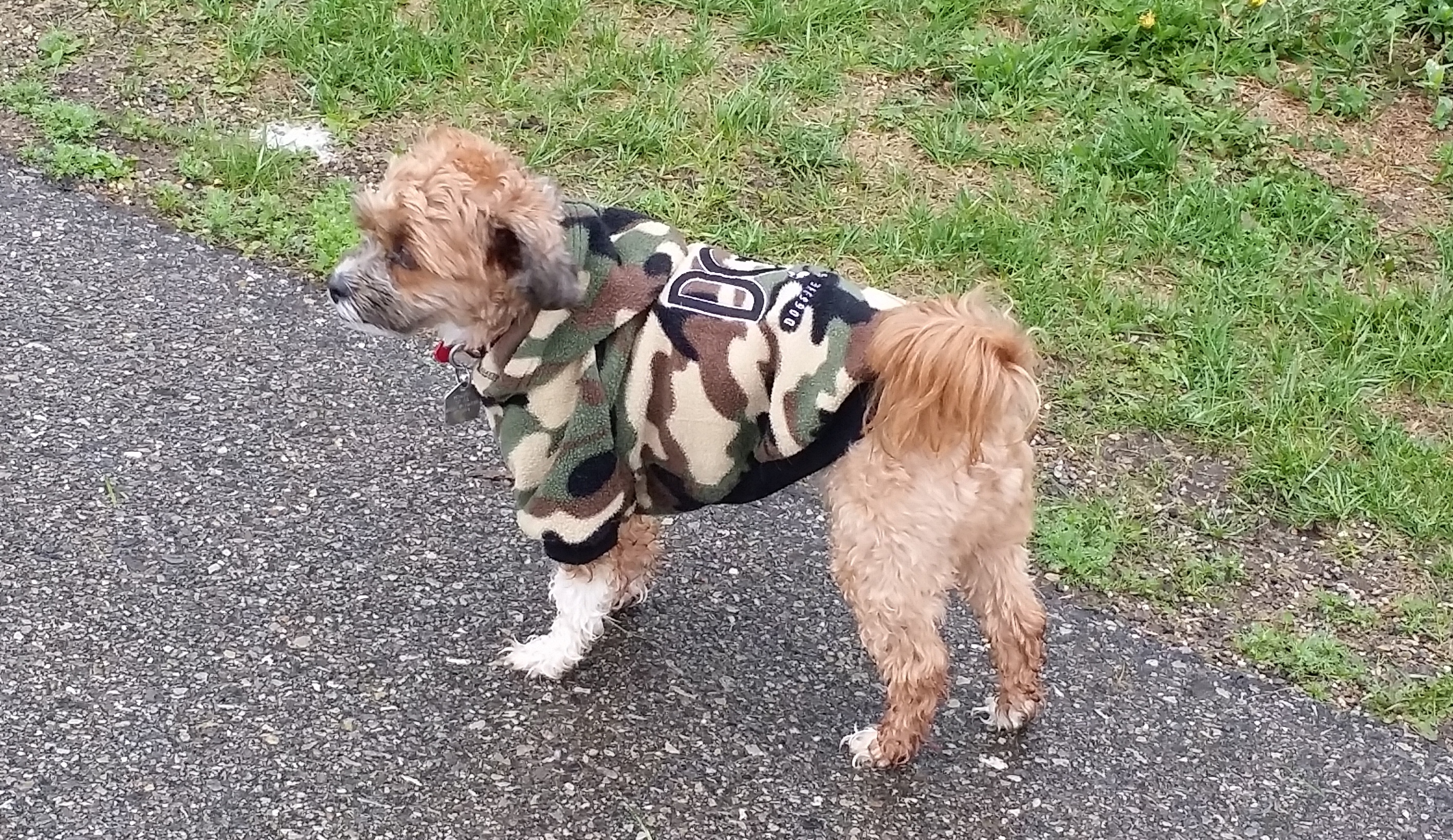 What the discerning pooch is wearing….. Posted on June 19, 2014 by MrPoochman “What….this old thing….!” Berkeley was rockin’ the camo on a wet Pooch Walk today. “It’s called camo-chic dahlinks…..! Lookin’ good Berkeley…lookin’ good…! Share this:Tweet Click to email a link to a friend (Opens in new window) Email Click to print (Opens in new window) Print Like Loading... Related
