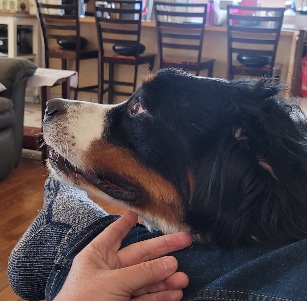 Whenever Wrigley moved in for some fussage, I always felt it my duty to advise prospective fussers that Wrigley had a different self-image when he was visiting with people and when being fussed. He transformed himself from an imposing 130+ lb Bernese into a 20 lb doe-faced puppy, who delighted in leaning into people whilst he accepted his well-deserved deification!